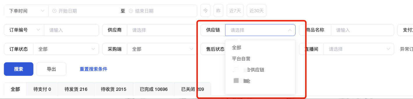 (3)供应链:支持筛选指定供应链的商品订单;