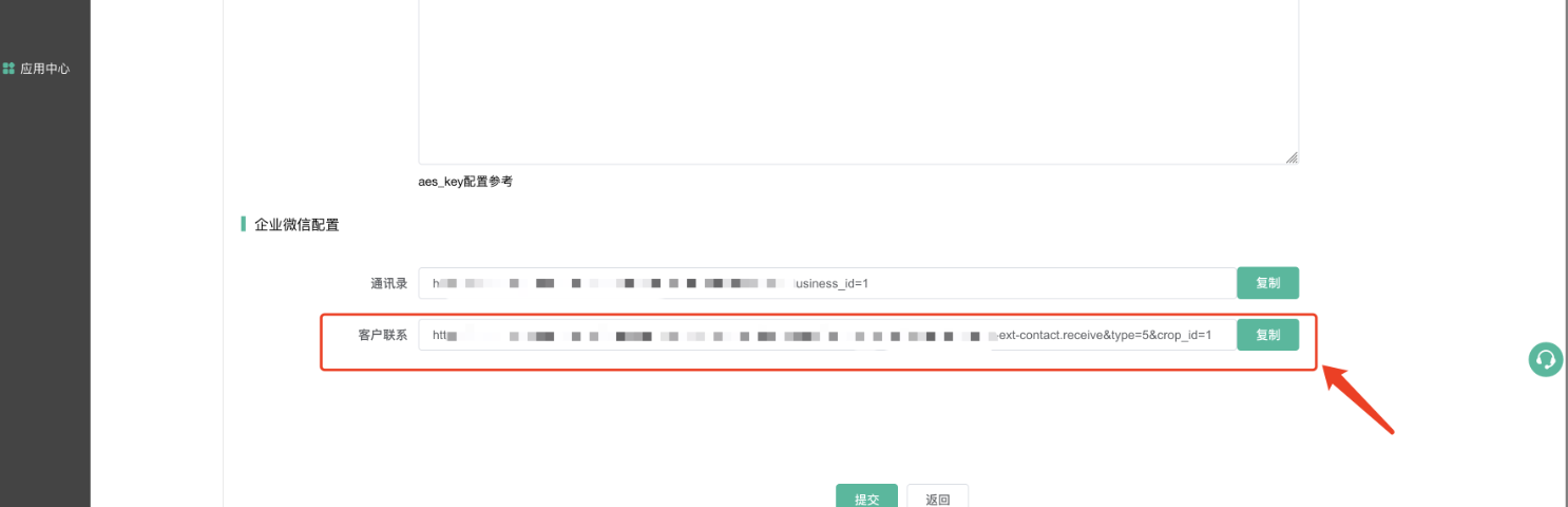 在企业管理PC端--设置--企业微信设置中复制客户联系URL,填写到上图的URL中;